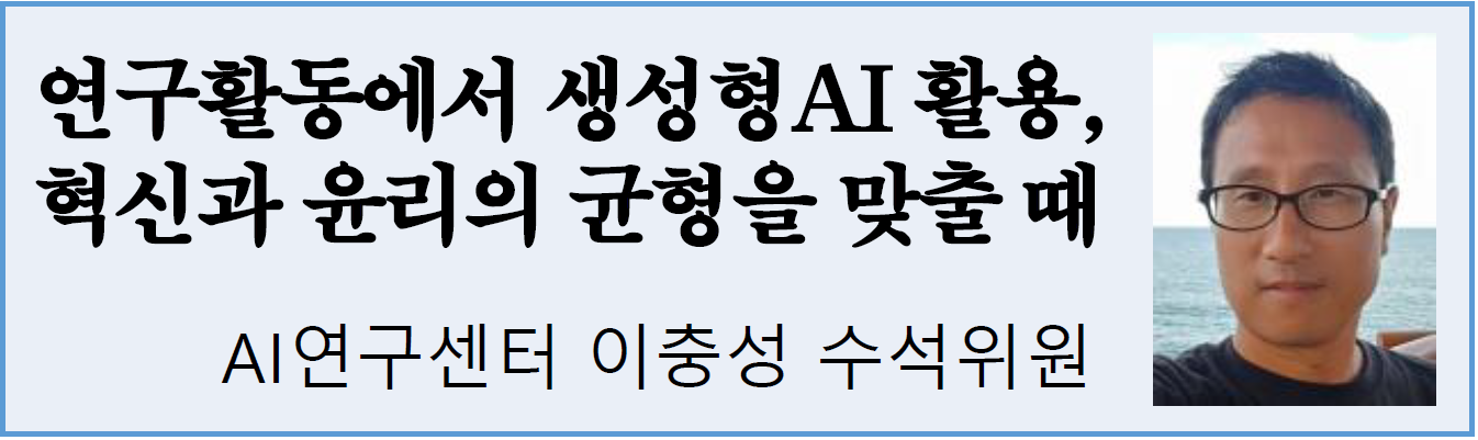 연구활동에서 생성형 AI 가 제공하는 이점은 분명하다. 다양한 자료를 폭넓게 결합해 연구자들에게 새로운 가설을 제시할 수 있고, 일상적인 반복 업무를 대폭 줄여 연구 효율성을 높여준다. 독창적인 아이디어를 촉발하는 도구로서도 유용하다. 그러나 이처럼 빠른 발전 속도만큼 편향·오류·표절·개인정보 유출 등 윤리적 문제와 법적 책임의 불명확성이 심화되고 있다. 이러한 윤리적 문제는 논의에 그치지 않고 실제 연구현장에서 적용할 수 있는 구체적인 실행방안과 지속적 개선 노력이 함께 이뤄져야 한다.